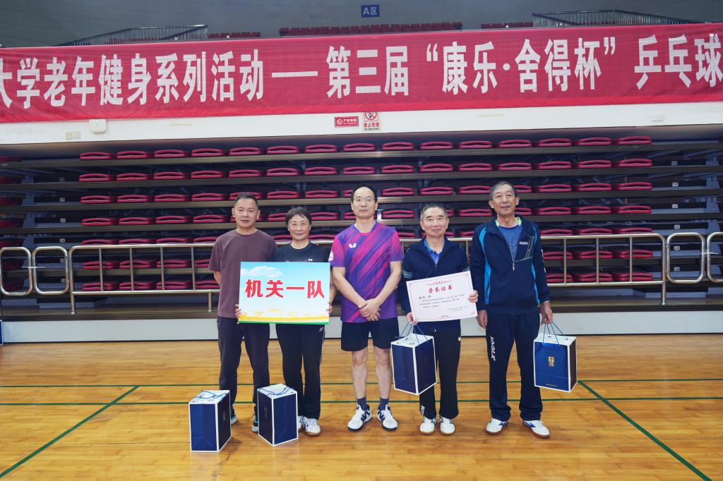 本届“康乐•舍得杯”乒乓球友谊赛在一片欢声笑语中圆满落幕。活动不仅为老同志们提供了切磋球技、增进友谊的平台,更生动展现了他们健康乐观、老有所为的精神风貌,为秋日的校园增添了一道亮丽的风景线。