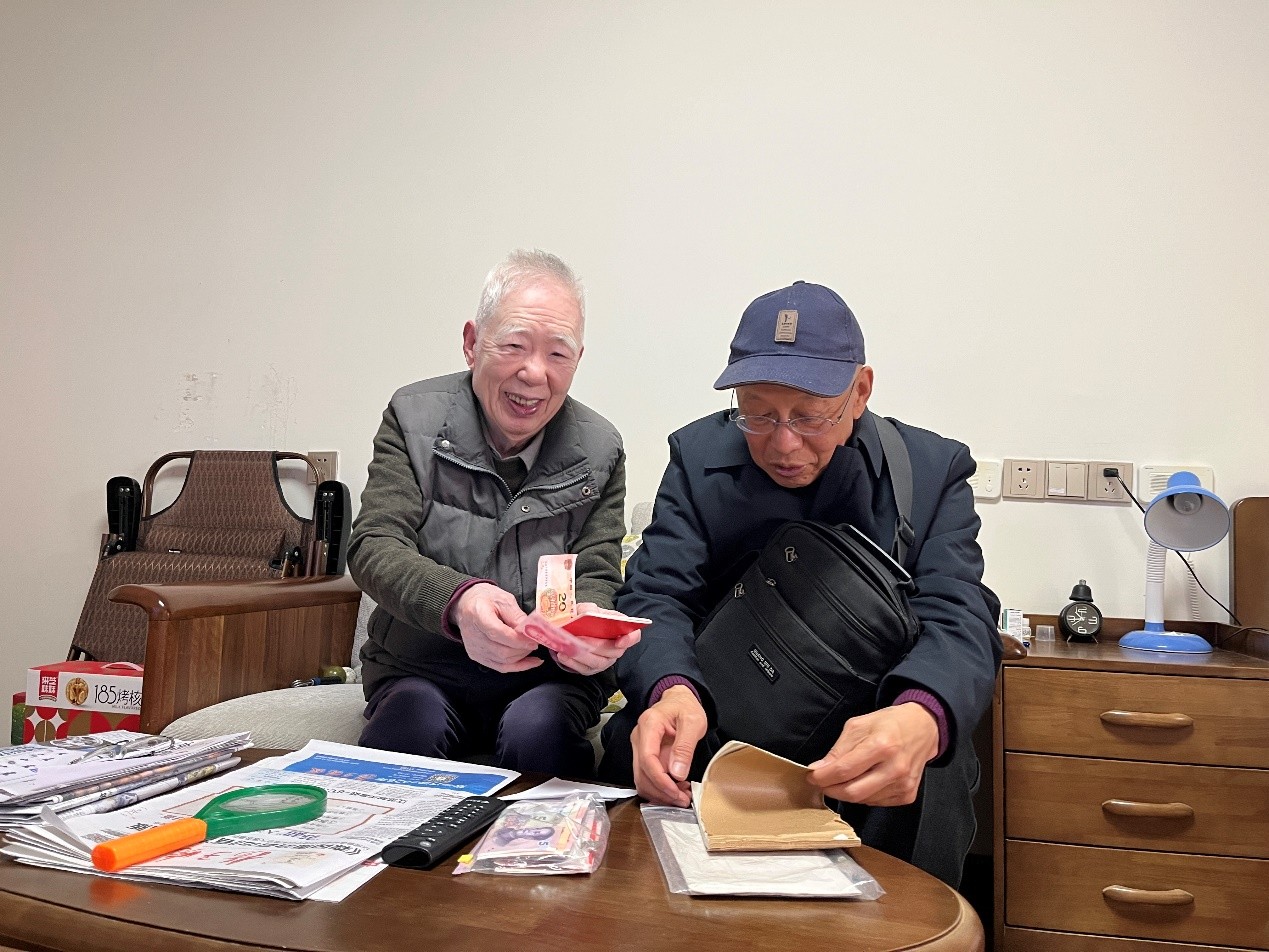 杭叔淼老师开心地把党费交给来看望他的吴平老师