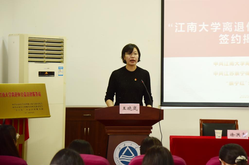 王晓岚说:江南大学离退休公益法律服务站的成立,是党建引领下优势互补的创新实践,服务站将成为连接党组织与群众、法律与生活的桥梁,为老同志们提供精准、贴心的法律服务。合作双方将全力支持共建工作,希望以实效为导向,真正为离退休教职工排忧解难,共同为法治社会建设贡献力量。张才兴在随后的致辞中,用四个“新”概括了本次共建的意义。他指出,一是以党建为引领,共建服务新平台,通过组织联建、资源整合,打造“党建引领、法治护航、敬老惠民”的特色品牌;二是以需求为导向,构建服务新机制,围绕遗嘱设立、财产继承、防诈骗等高关注度问题,建立“法律讲座、咨询、援助”三位一体的服务体系;三是以长效为目标,凝聚协同新合力,通过建立领导小组统筹、联络员对接、联席会议推进的协作机制,推动合作走深走实;四是以信任为基石,续写合作新篇章,将协议内容转化为惠老服务的实际举措,共同探索为老法律服务新模式。