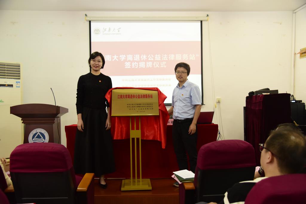 在与会领导和老同志的见证下,张才兴与王晓岚共同为“江南大学离退休公益法律服务站”揭牌,宣告这一面向离退休教职工的公益法律服务平台正式成立。
