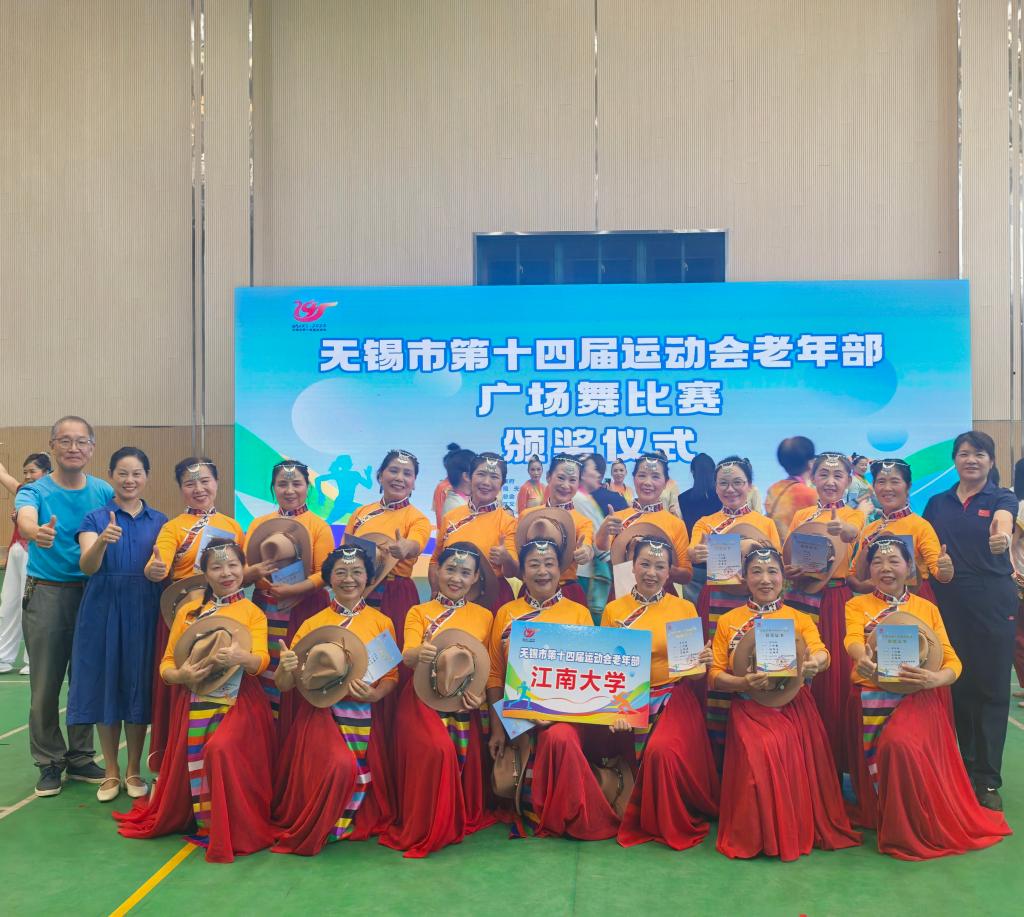 9月27日,无锡市第十四届运动会老年部广场舞团体赛在江苏省税务学校圆满落幕。本次赛事以“融合助力健身,贡献银发力量”为主题,贯彻“文体养老,健康平安”发展理念,吸引全市16支代表队同台竞技,围绕规定套路与自选套路展开角逐。江南大学至善舞队参与了自选套路的比赛。离退休党委副书记、离退休工作处副处长陈祎,老体协副会长、秘书长戴平到现场为队员鼓劲。