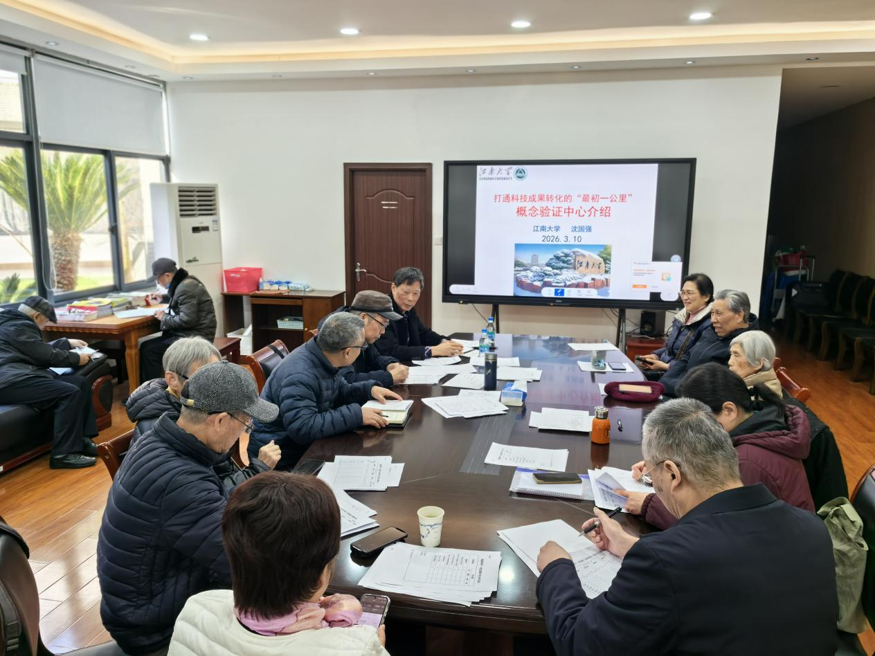 阳光明媚、桃红柳绿。3月10日,江南大学老科协管理分会采用线上线下相结合的方式,举办“打通科技成果转化的‘最初一公里’概念验证中心介绍”的科普讲座。离退休党委副书记、副处长徐洪亮与20位离退休老师在蠡湖校区南区大学生活动中心一楼离退休处会议室线下听取讲座及开展现场交流,老科协管理分会全体会员在线上通过微信群进行,共有60多人参加了科普活动。本次讲座由老科协管理分会会长、研究员级高级工程师沈国强主讲。