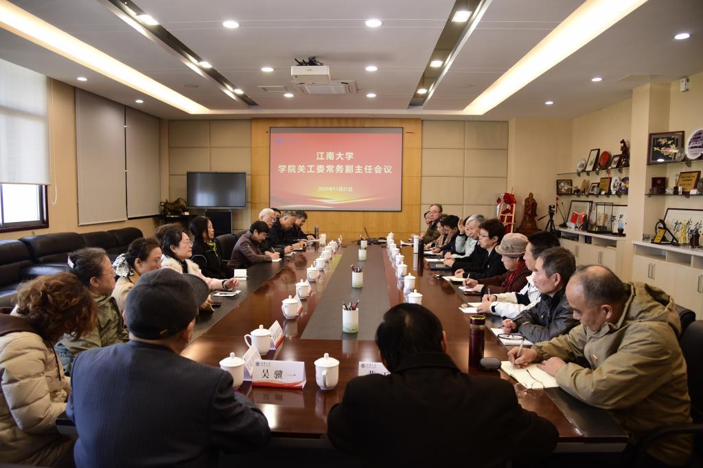 江南大学关工委于2025年11月21日,在食品学院910会议室召开二级学院关工委常务副主任2025年工作总结交流会。校关工委常务副主任娄国栋出席并讲话,会议由离退休党委书记、校关工委秘书长张才兴主持。20个学院关工委常务副主任,以及校关工委副秘书长吴骥一、衡延笃、黄正明,办公室主任姚欣等同志参加了会议。